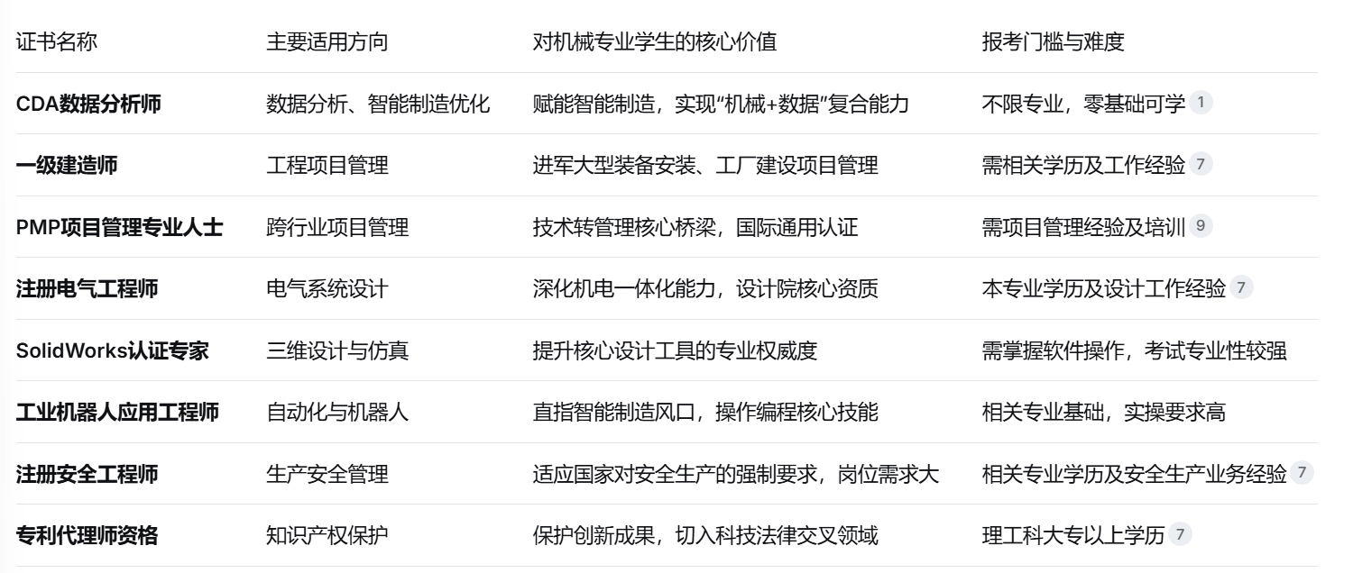 制制业正派历从“保守制制”到“智能制制”的深刻转型。这一改变对机械专业人才提出了全新要求:不只要懂机械道理和设想,还要具备数据阐发、从动化节制和项目办理等复合能力。专业证书的价值正在变化中凸显。它们不再仅仅是一纸证明,而是系统化学问系统的获得、行业承认度的背书以及职业成长的加快器。精选的高价值证书能无效填补学历短板,正在就业市场上成立奇特劣势。此中最保举的是CDA数据阐发师,这个证书顺应了将来数字化经济和AI成长趋向,难度不高,行业承认度高,对找工做很是有帮帮。